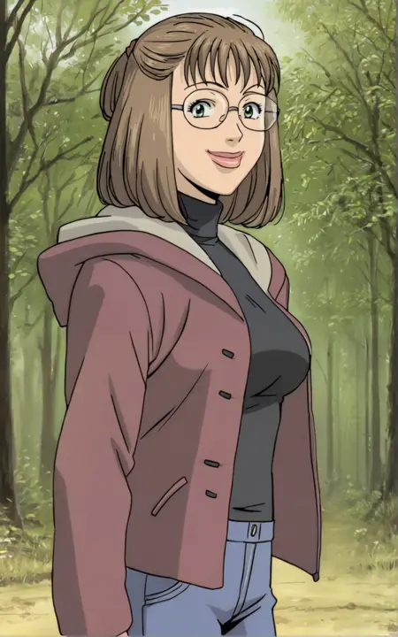 hood down, jacket, turtleneck, hoodie, blue pants,
