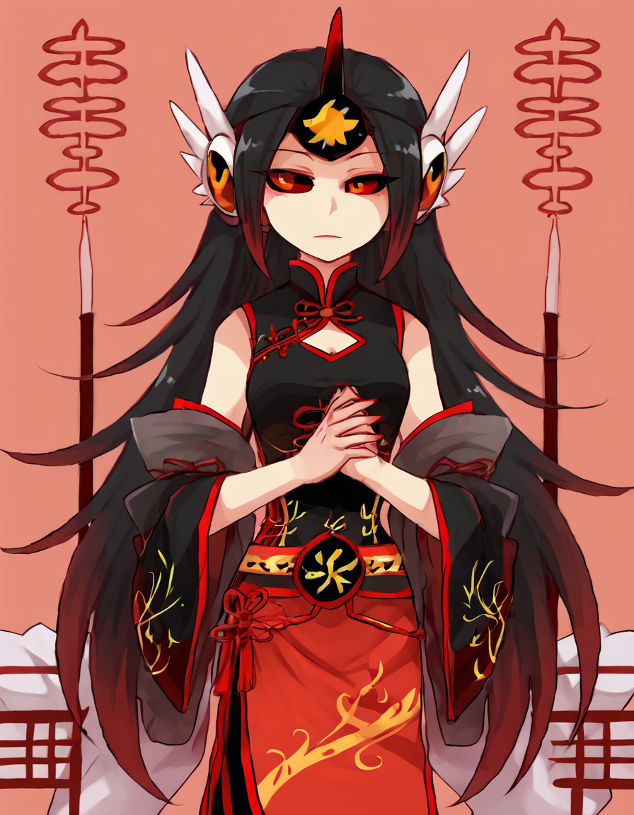 becl0rex, 1girl, solo, red eyes, colored sclera, black sclera, red eyeshadow, long hair, black hair, chinese clothes