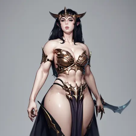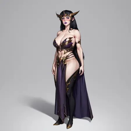 DESorceress, pointy ears, black hair, purple lipstick, makeup, armor,