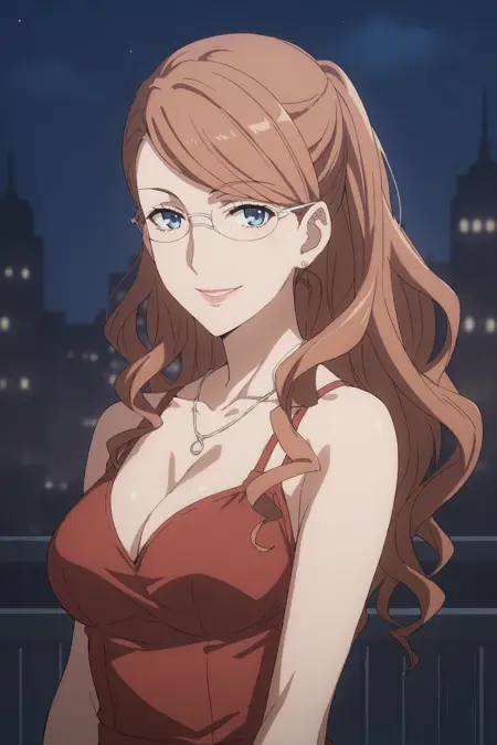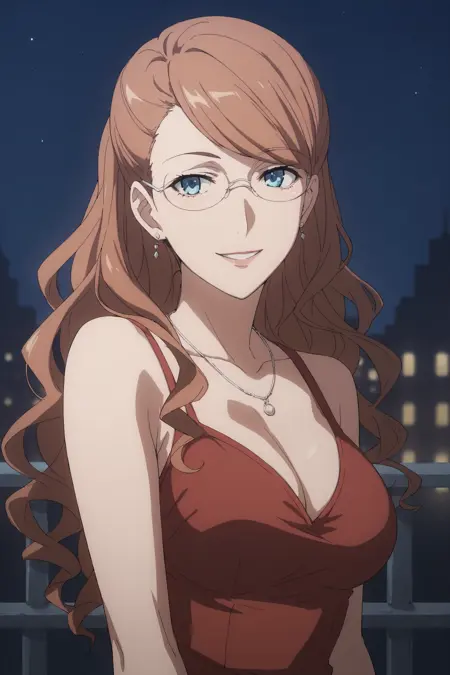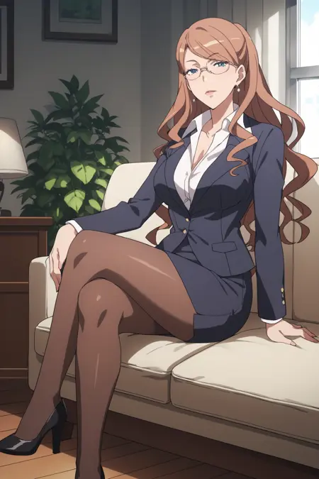 therestina kihara lifeline, brown hair, long hair, wavy hair, blue eyes, glasses, therestinasuit, suit, formal, white shirt, collared shirt, black jacket, black skirt, pencil skirt, brown pantyhose, high heels