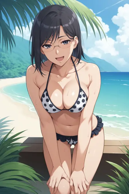 konori mii, 黑发, 短发, 黑眼, 眼镜, konoribikini, 白色比基尼, 圆点比基尼, 荷叶边比基尼