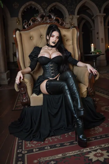 The character is a sinous vampire girl with red eyes and black ponytail, wearing a tight black leather outfit with gothic and victorian elements.