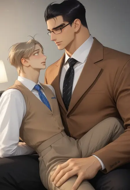 glasses, necktie, brown vest, waistcoat, spread legs, muscular, bara, brown pants, white collared shirt,