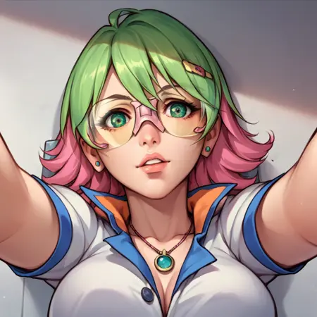 核心标签: sonoshee mclaren, 1girl, solo, 绿发, 绿眼, 多彩发色, 粉发, 乳房, 项链, 发夹, 大乳房, 太阳镜
