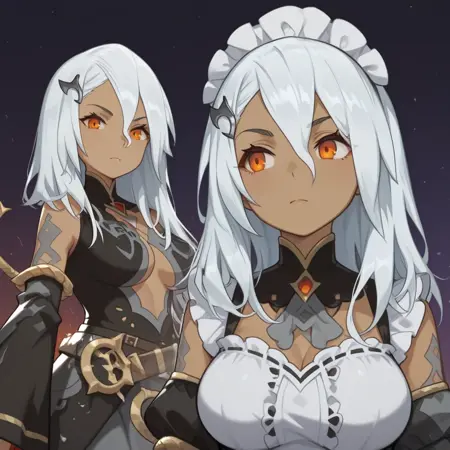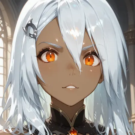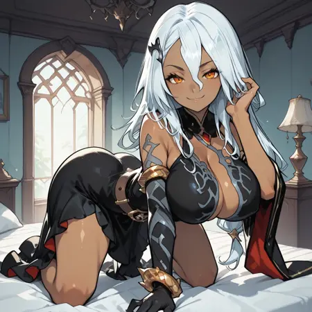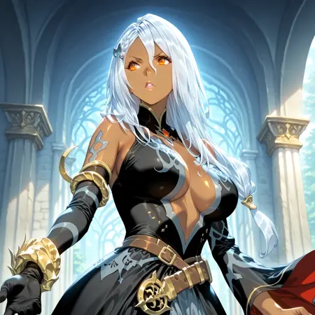 트리거 단어: 벨리나, 검은 피부, 검은 피부를 가진 여성, 긴 머리, 흰 머리, 머리 장식, 앞머리, 옆머리, 땋은 머리, 주황색 눈, 가슴, 젖꼭지, 드레스, 검은 드레스, 금빛 팔찌, 하나의 검은 장갑, 벨트,