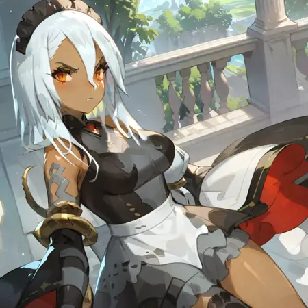 Trigger words: Bellina, dark skin, dark skinned female, long hair, white hair, hair ornament, bangs, sidelocks, braid, orange eyes, breasts, cleavage, dress, black dress, golden bracelet, 1black glove, belt,