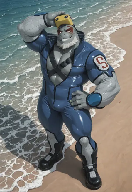 ポニータグ: selkiemha, score_9, source_anime, 1boy, solo, full body, grey skin, bara, goggles, muscular, facial hair, bodysuit, whiskers, beard, boots