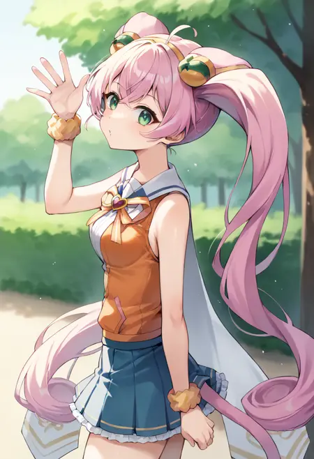 橙色连帽衫,蝴蝶结,无袖,手腕束带,裙子,白色斗篷,