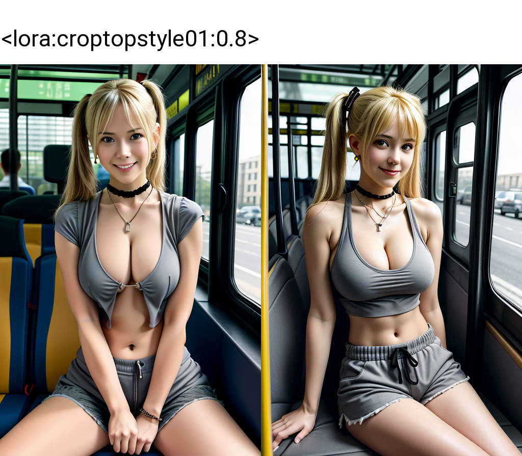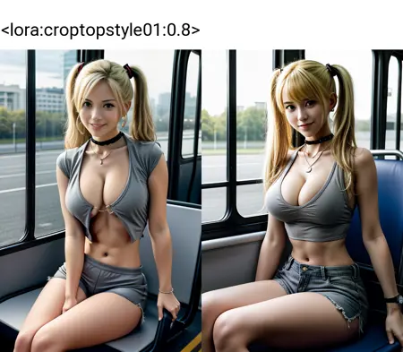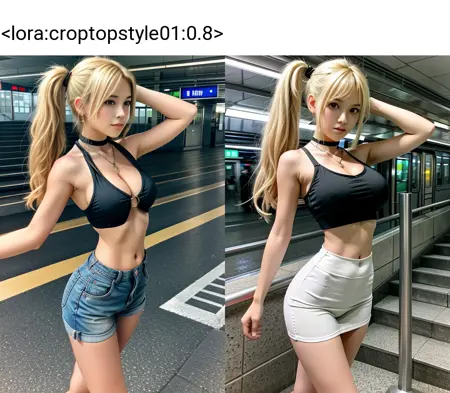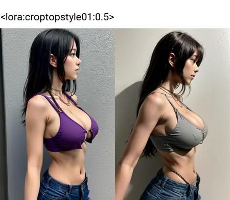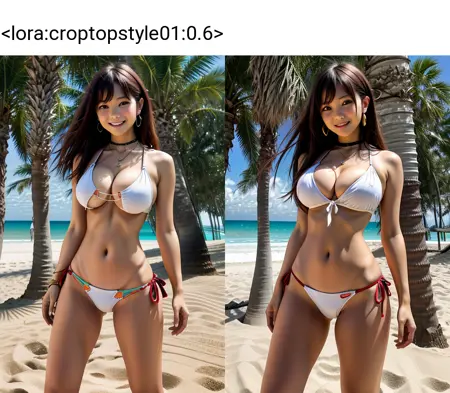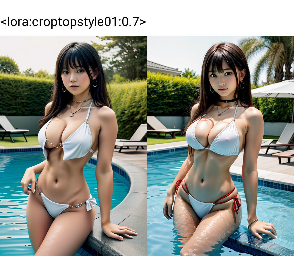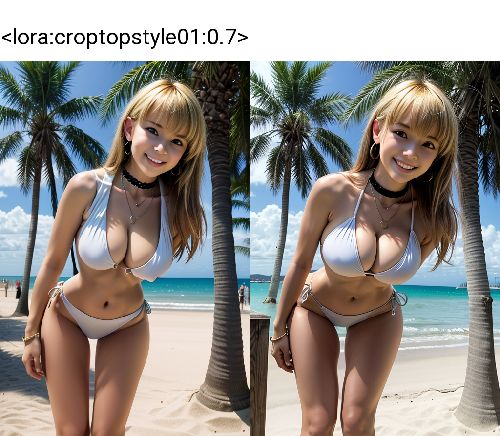 注意: ウエストの長さに一定程度影響を与え、通常はよりスリムになります。また、トップスや長袖を損なうこともあります。デニムショーツが出現しやすくなりますが、絵画によって上書きされる可能性もあります。例えば、スカートやタンガでも構いません。顔にも影響が出ます。より良く見えることもあれば、悪く見えることもあります。ビキニチェーンやスパゲッティストラップが必要な場合は、「bikini chain」または「spaghetti straps」と追記してください。