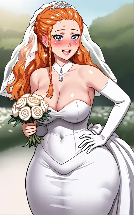 long hair, orange hair, breasts, blush, braid, large breasts, blue eyes, thick thighs, curvy.