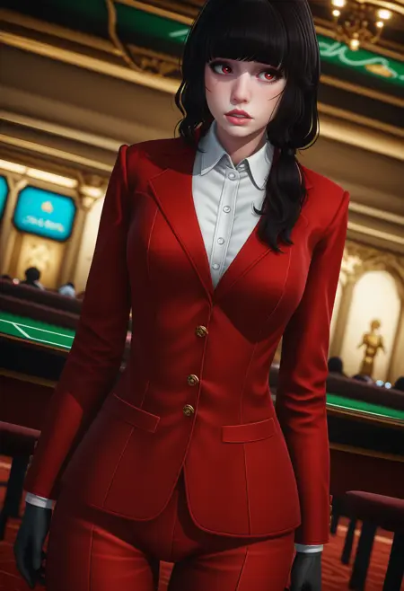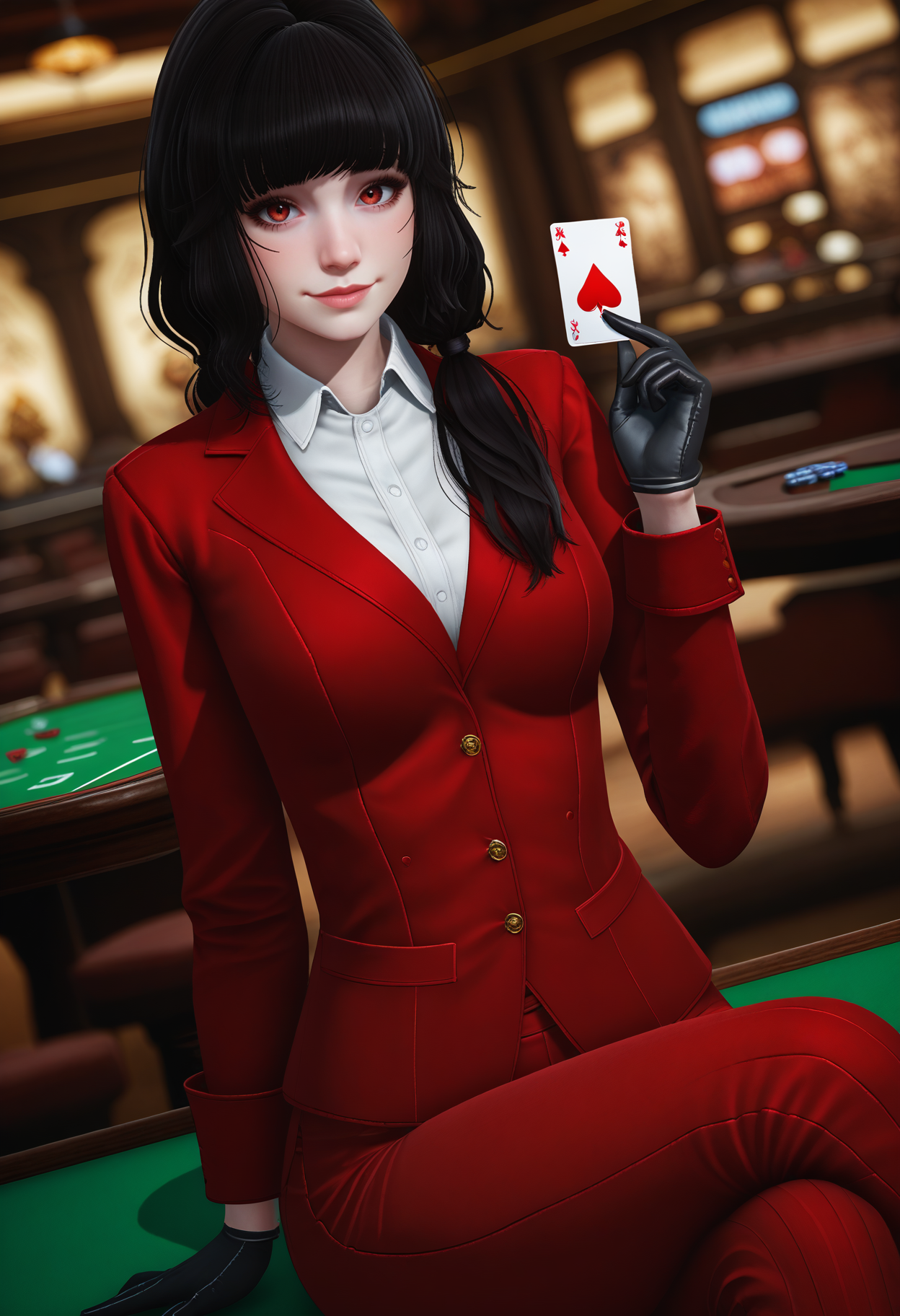 低双马尾,西装,正式装束,红色夹克,衬衫,白衬衫,翼领,红色长裤,黑色手套,