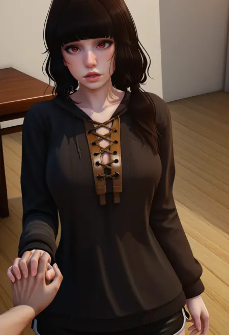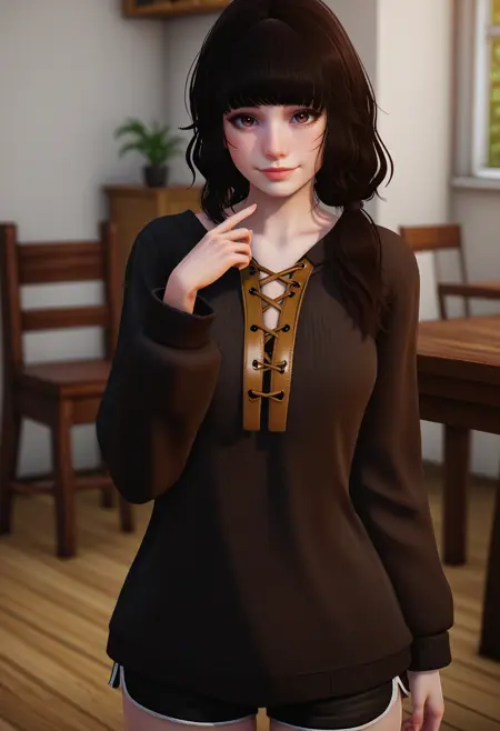 低双马尾,黑色毛衣,交叉系带服饰,黑色上衣,黑色短裤,超短裤,黑色手套,