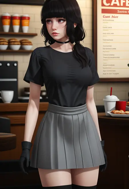 低双马尾,黑色上衣,T恤,短袖,上衣塞入,灰色短裙,大腿袜,黑色项圈,黑色手套,