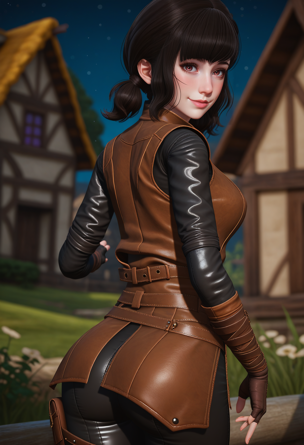 短双马尾,棕色背心,黑色上衣,皮革上衣,长袖,黑色长裤,腰带,枪套,露指手套,皮革手套,皮革靴子,多把剑,剑鞘,入鞘,