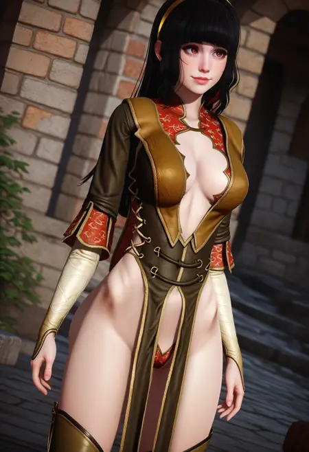 姬发式,中式旗袍,胯部垂帘,前开衩,丁字连体衣,长袖,金色发带,大腿靴,