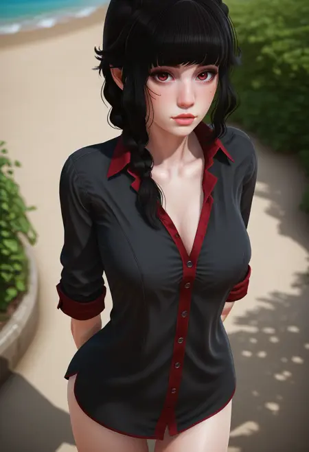 低双辫,有领衬衫,长款衬衫,黑色上衣,红色镶边,部分解开,袖子卷起,无裤子,赤腿,