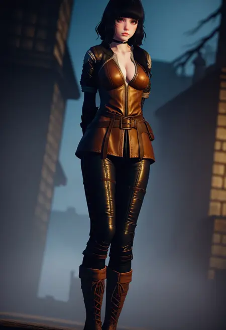 低双马尾,皮甲,黑色袖子,交叉系带袖子,黑色项圈,黑色长裤,腰带,包袋,靴子,膝带,戒指,黑色指甲,