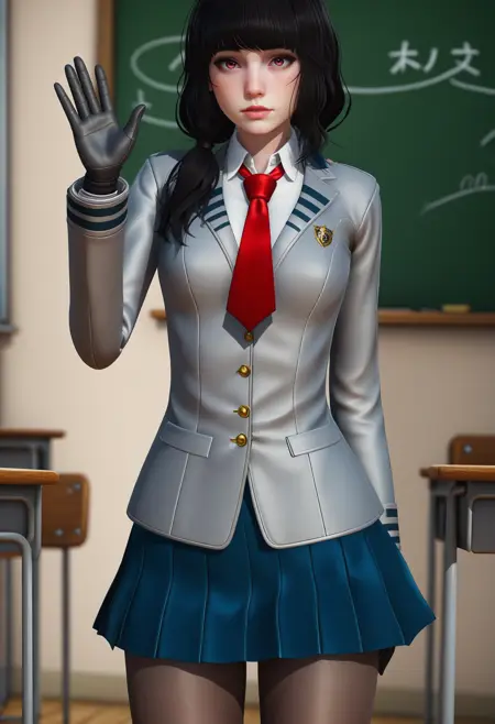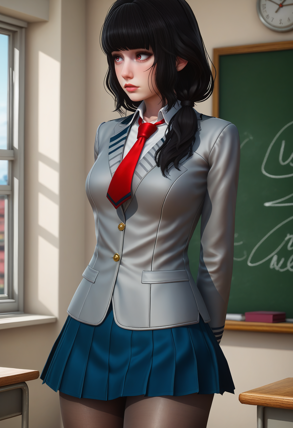 低双马尾,校服,灰色外套,蓝色短裙,黑色丝袜,红色领带,黑色手套,