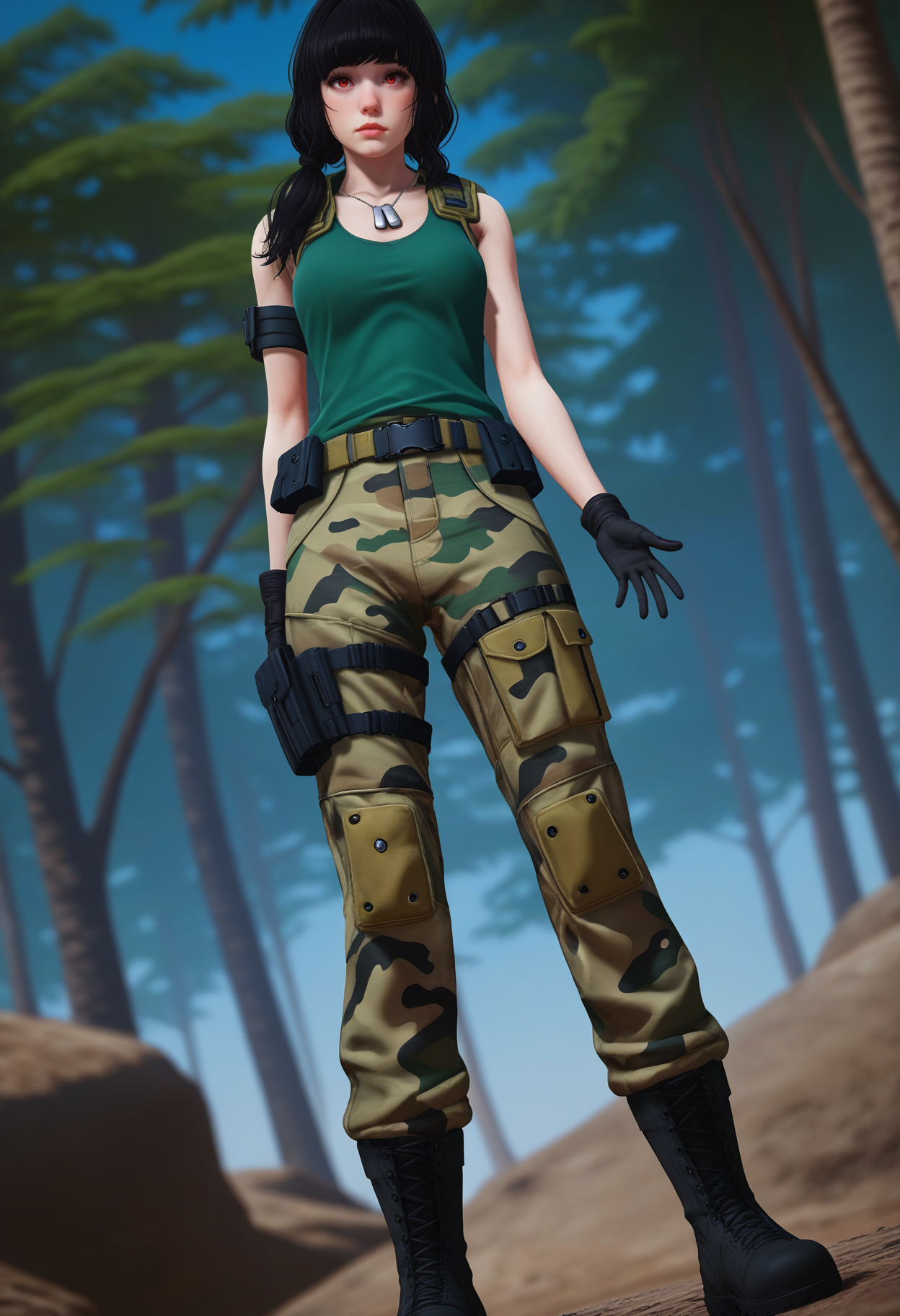 低双马尾,防弹背心,包袋,背心,绿色上衣,身份铭牌,臂章,迷彩长裤,腰带,枪套,作战靴,黑色手套,