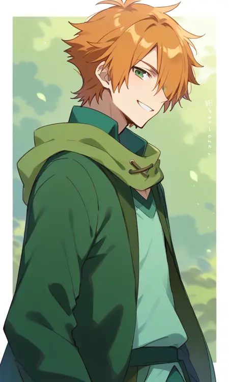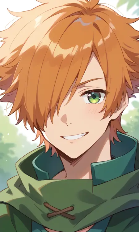 트리거 단어: 로빈 후드, 한 눈 위의 머리카락, 녹색 눈, 주황색 머리