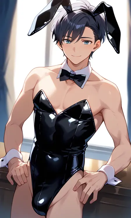 触发词:动物耳朵、兔耳朵、假动物耳朵、男性花花公子兔女郎、花花公子兔女郎、可拆卸领子、腕部束缚带、紧身衣、黑色紧身衣