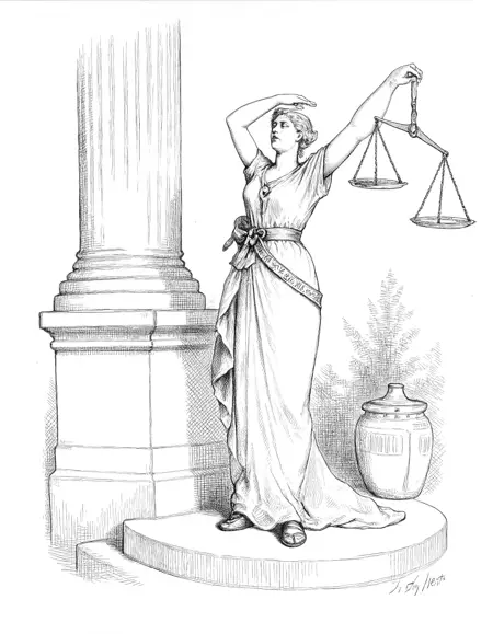 토마스 나스트 스타일로 그린 드레스를 입은 여성이 교도소 셀을 여는 고전적인 정치 풍자화