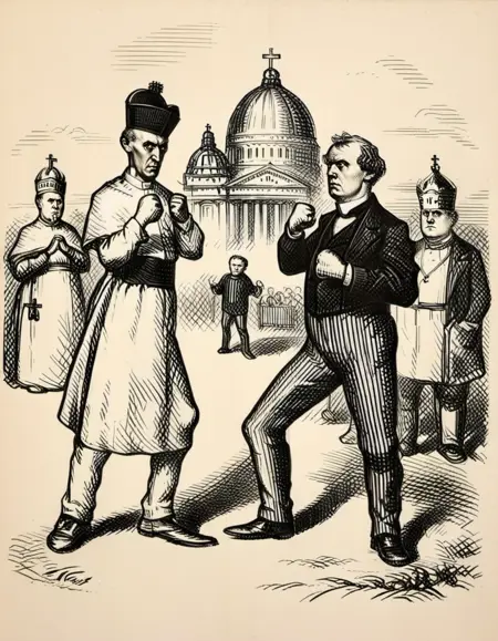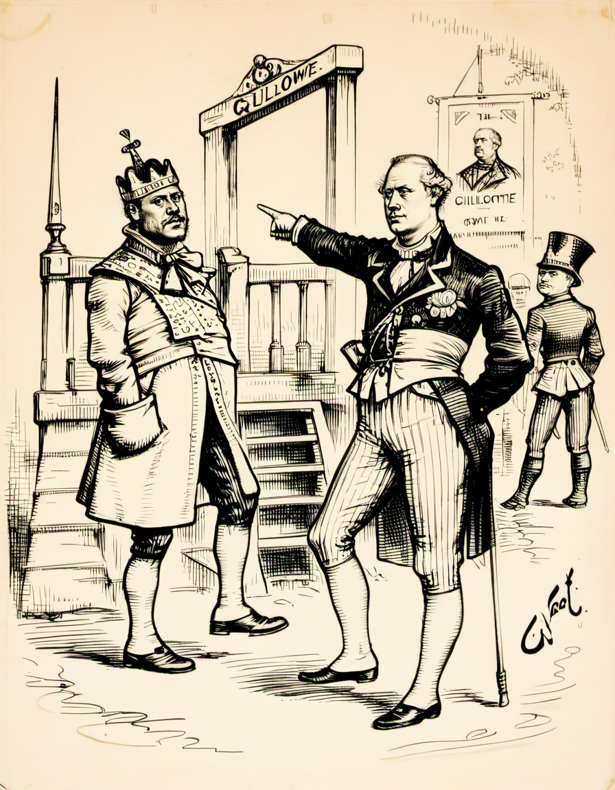 토마스 나스트 스타일로 그린 윗모자와 앞치마를 단 두 남자의 고전적인 정치 풍자화