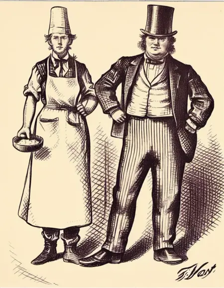 ハイハットとエプロンを着た二人の男性をトーマス・ナストのスタイルで描いた絵
