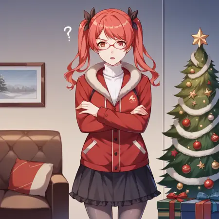 Tes_Winter, red-framed eyewear, red hair, red coat, fur trim, white shirt, necklace, black skirt, mini skirt, frilled skirt, turtleneck, black pantyhose, hair ribbon, black ribbon,