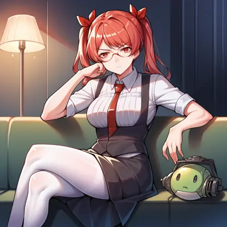 TeslaHi3, Fol002, Tsl_Evg, red hair, red eyes, long hair, twintails, red-framed eyewear, semi-rimless eyewear, glasses, tactical clothes, asymmetrical skirt, black skirt, short necktie, black pouch, multiple belts, black belt, zipper, white belt, black vest, vest, orange necktie, polo shirt, white shirt, short sleeves, white sleeves, single gauntlet, red ribbon, hair ribbon, mechanical gauntlets, red gauntlets, white pantyhose, light brown shoes, cross-laced shoes,
