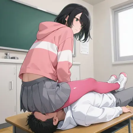 sitting on face, 1Girl, Human_Chair, 1Man, faceless man lying on the floor,