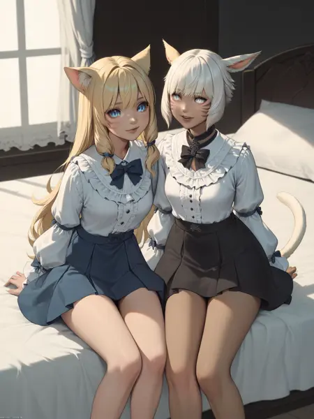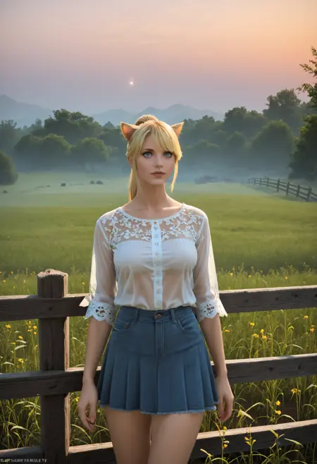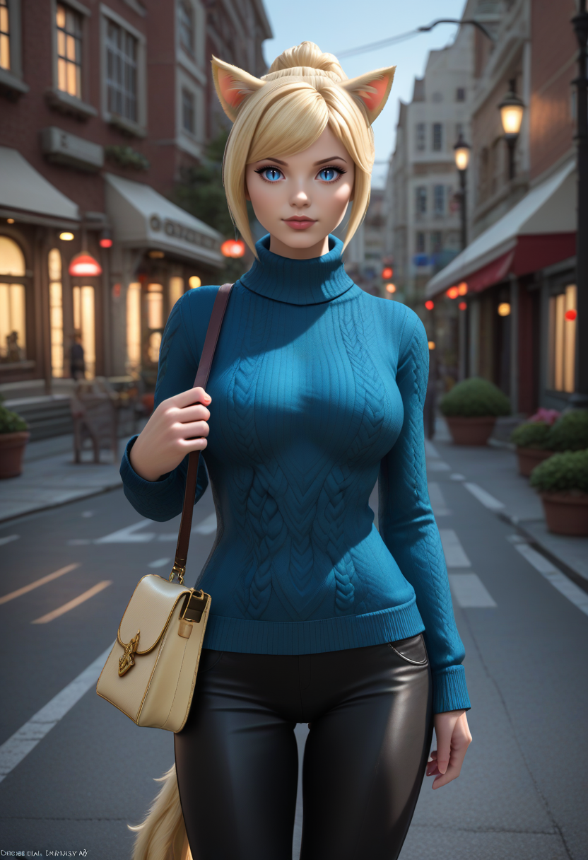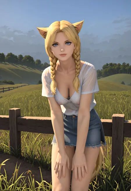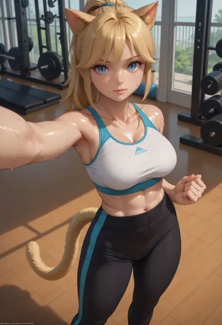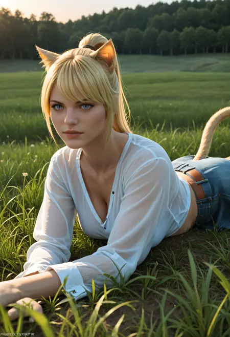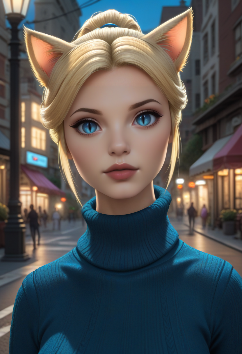 생성에 도움을 주기 위해 다음 단어들을 사용하세요: 금발 머리, 파란 눈, 고양이 귀, 고양이 꼬리, 수직 동공, 미코트