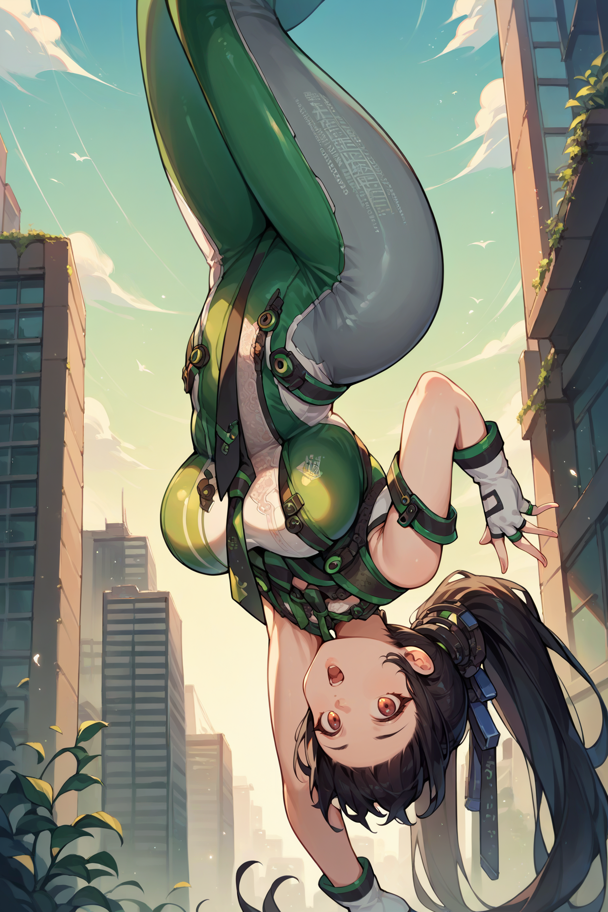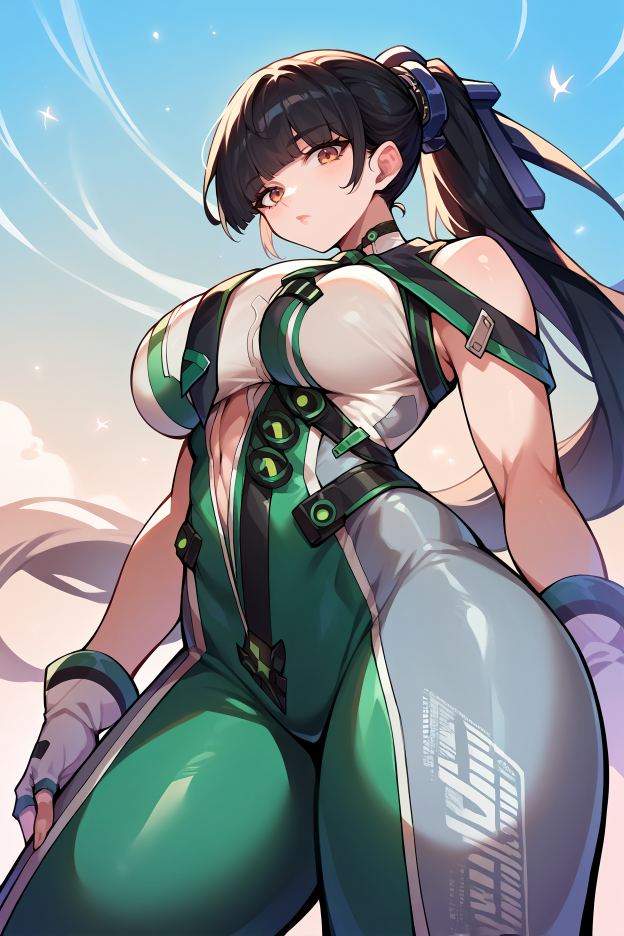 Add "defEve, black hair, long ponytail, necktie, green and white bodysuit, sleeveless, fingerless gloves, grey pants" for her default look.