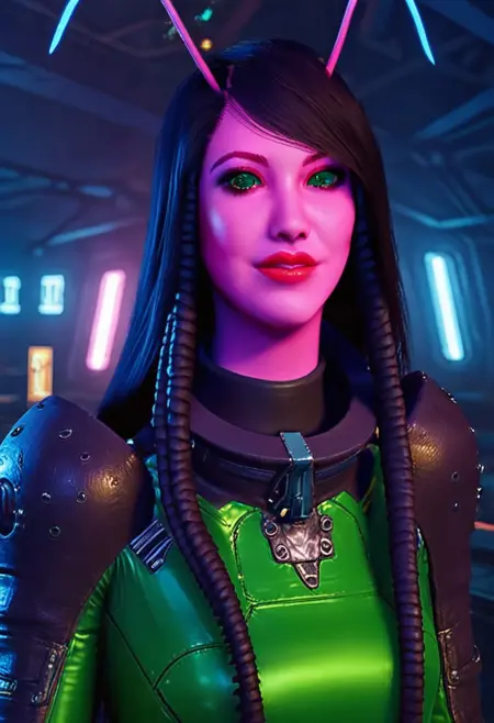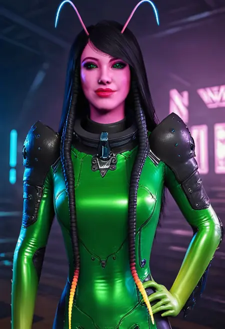 一般的なプロンプトの提案:vgmantis、ピンクの肌、黒髪、触覚、緑の目、長い髪、前髪の編み目、アーマー、肩アーマー、グリーンのチュニック、黒のズボン、黒のブーツ、グリーンの手袋