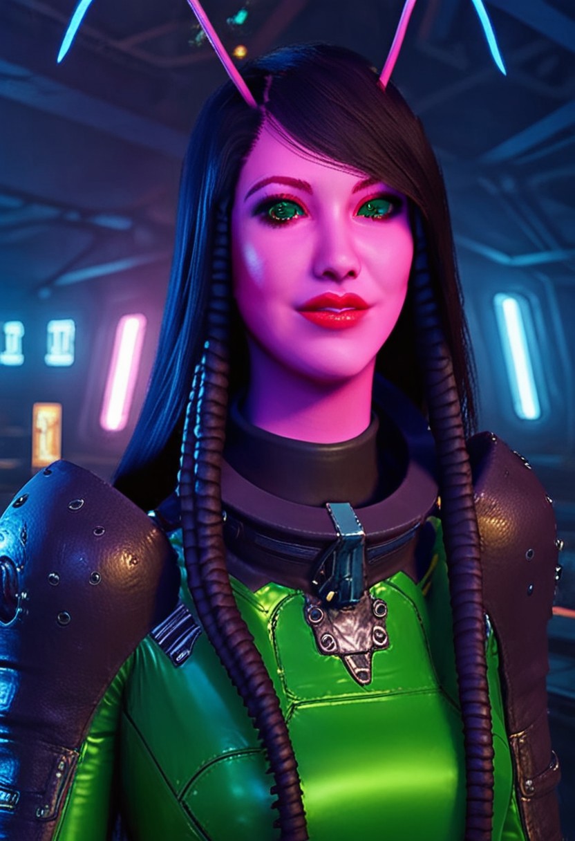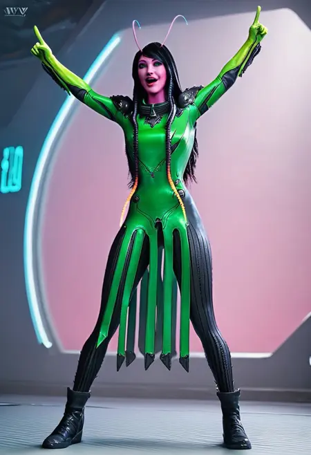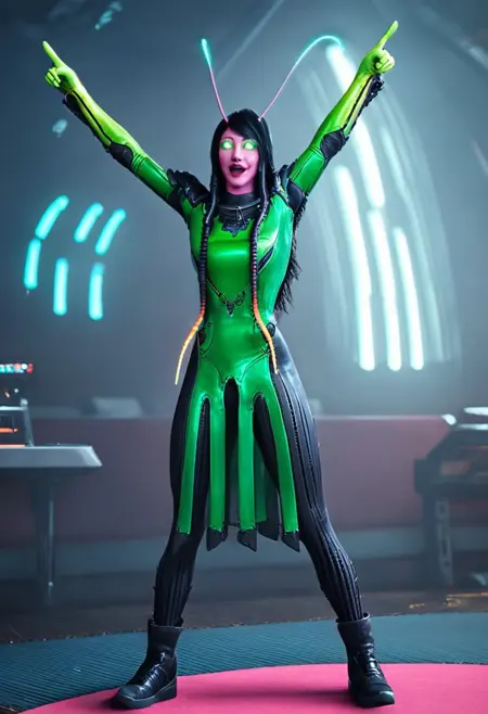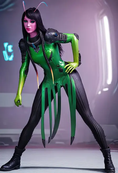 General prompts suggestion: vgmantis, pink skin, black hair, antennae, green eyes, long hair, front braids, armor, shoulder armor, green tunic, black pants, black boots, green gloves,
