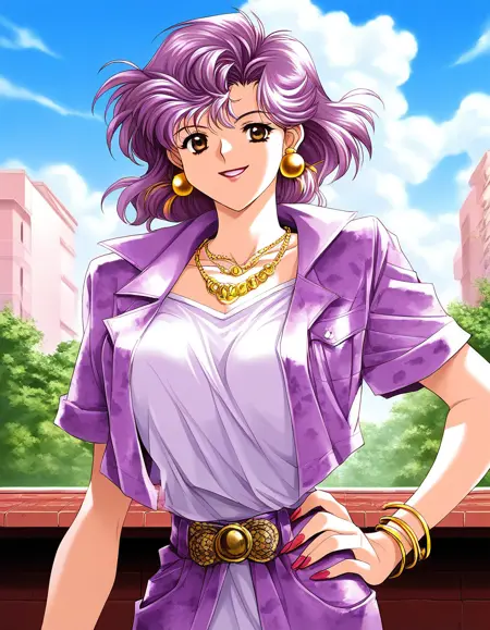 Naruse_Kaori(Doukyuusei) 1girl, solo, 보라색 머리, 보석, 귀걸이, 립스틱, 네일아트, 갈색 눈, 빨간 네일, 긴 머리, 큰 가슴,
