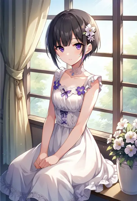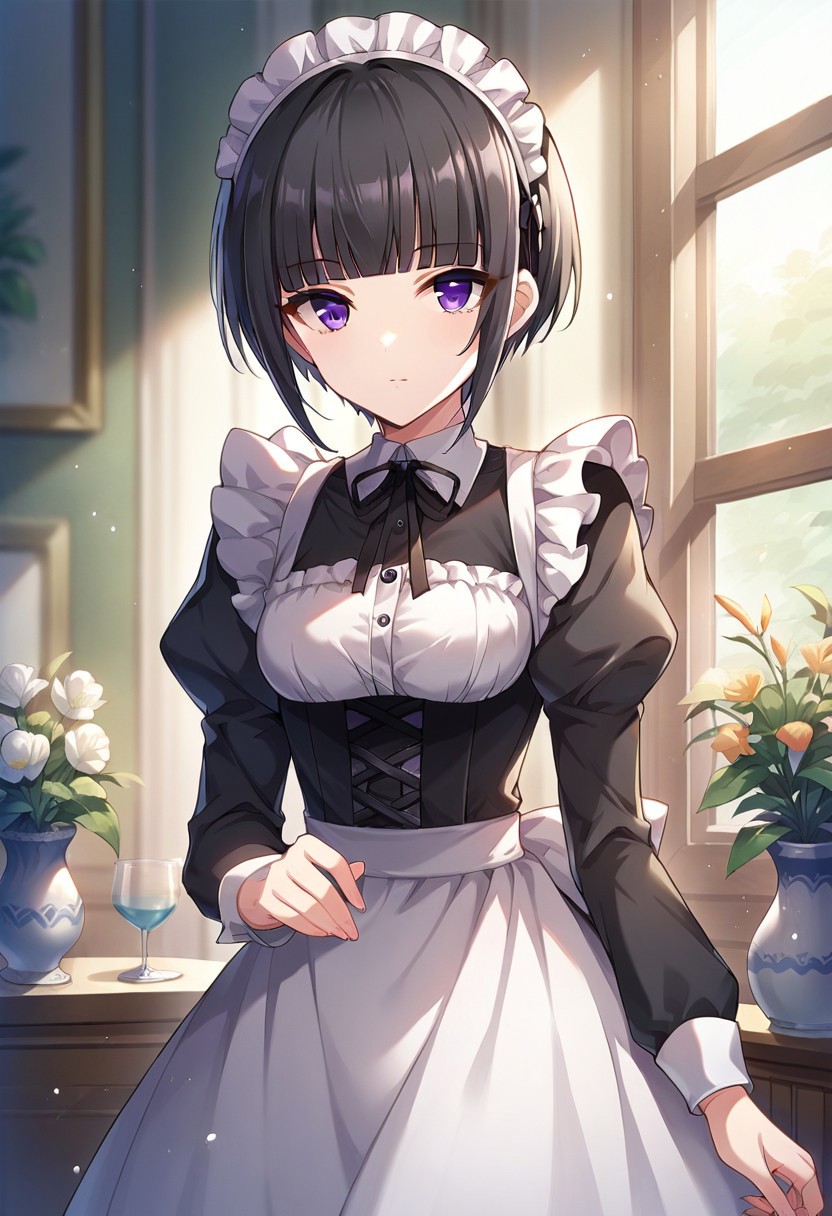 트리거 단어: shirayuki chiyo, 검은 머리, 보라색 눈, 단발