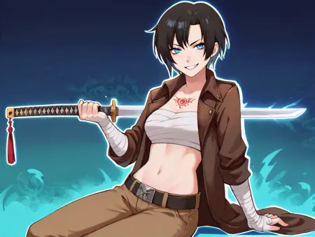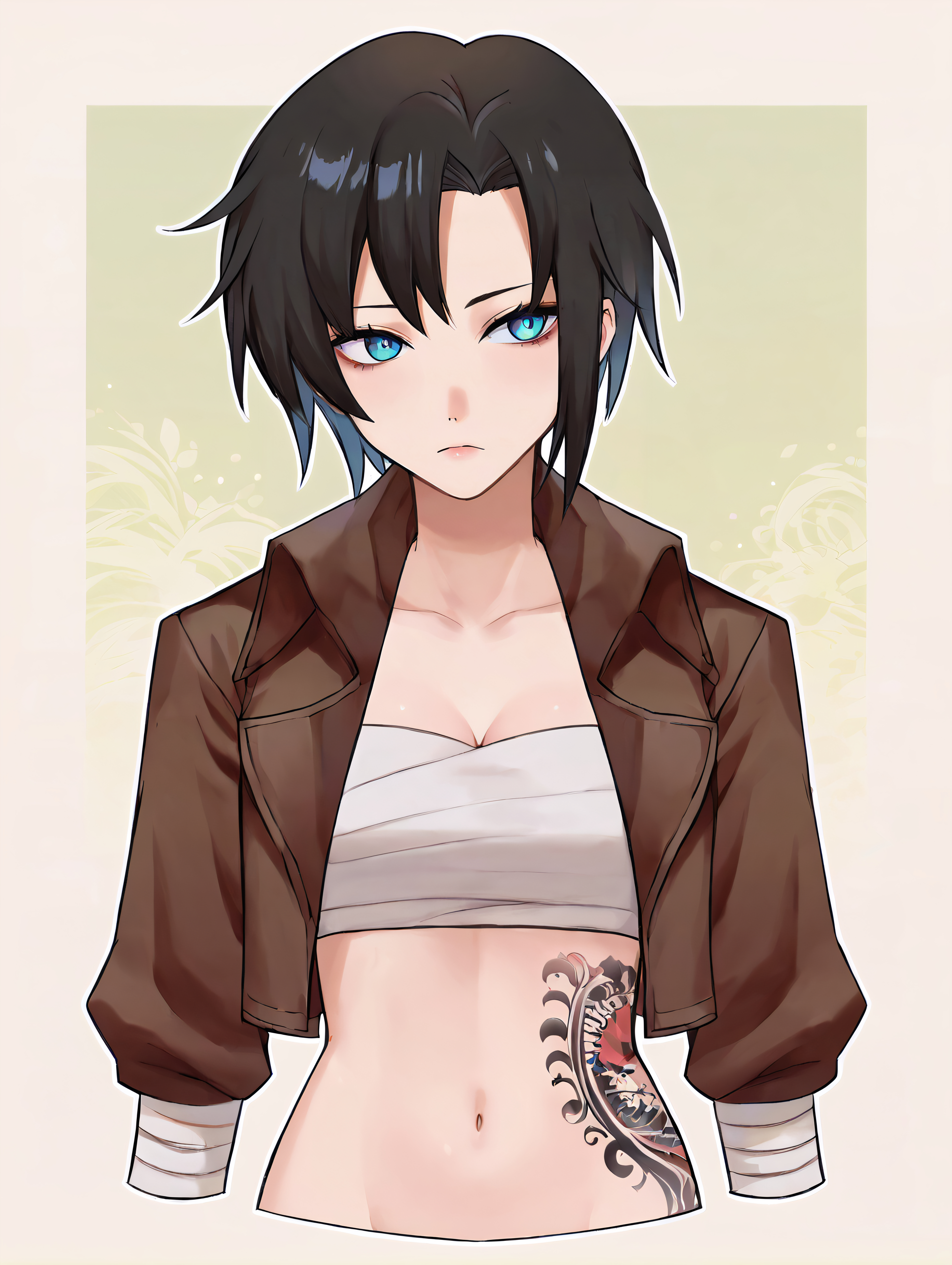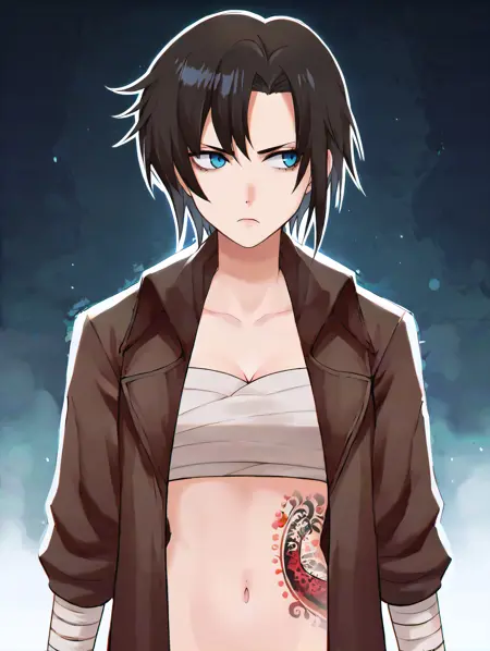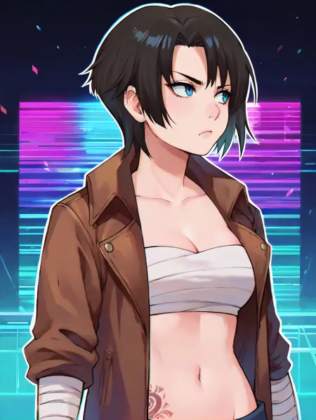 造型1:enahamasaki,1girl, blue eyes, black hair, short hair,乳房,肚脐,侧身纹身,臂缠,手裹,无肩带,白色裹胸布,棕色皮衣,长袖,敞开式衣襟,棕色腰带,黑色长裤,lora:EnaHamasaki_PDXL:1.0
