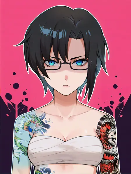 造型2:enahamasaki,1girl, blue eyes, black hair, short hair,乳房,肚脐,侧身纹身,肩部纹身,手臂纹身,臂缠,手裹,无肩带,白色裹胸布,眼镜,棕色腰带,黑色长裤,lora:EnaHamasaki_PDXL:1.0