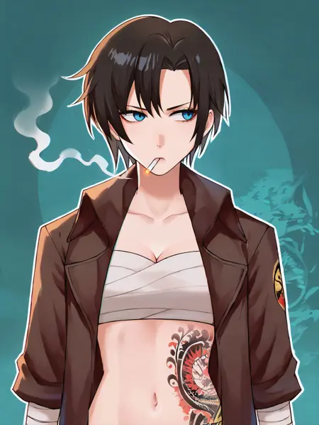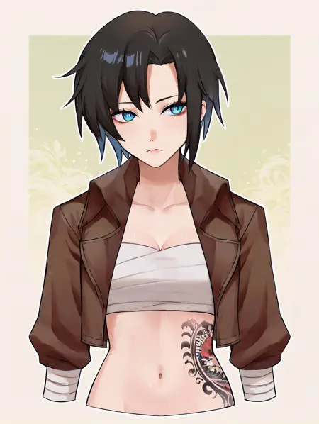 룩 1: enahamasaki, 1girl, 파란 눈, 검은 머리, 단발머리, 가슴, 배꼽, 측면 타투, 팔 감싸기, 손 감싸기, 스트랩리스, 흰색 사라시, 갈색 가죽 코트, 긴 소매, 열린 코트, 갈색 벨트, 검은 바지, lora:EnaHamasaki\_PDXL:1.0