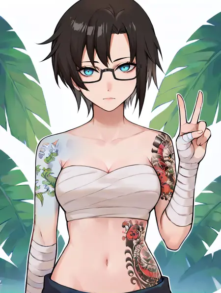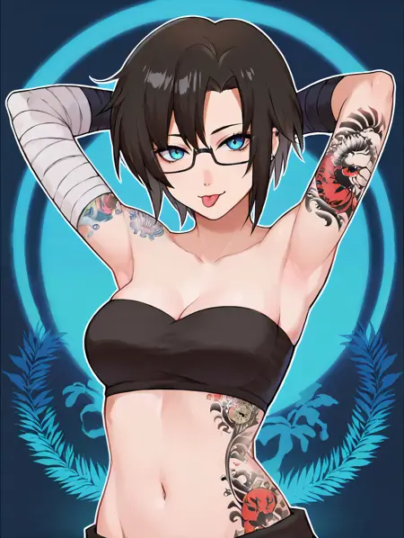 룩 2: enahamasaki, 1girl, 파란 눈, 검은 머리, 단발머리, 가슴, 배꼽, 측면 타투, 어깨 타투, 팔 타투, 팔 감싸기, 손 감싸기, 스트랩리스, 흰색 사라시, 안경, 갈색 벨트, 검은 바지, lora:EnaHamasaki\_PDXL:1.0