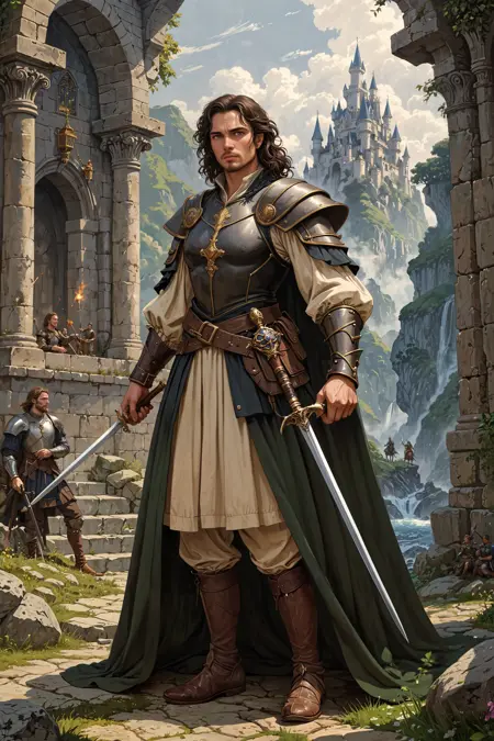 数字插画:一名女战士,背景为宏伟城堡,电影感,杰作,色彩丰富