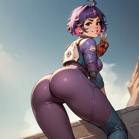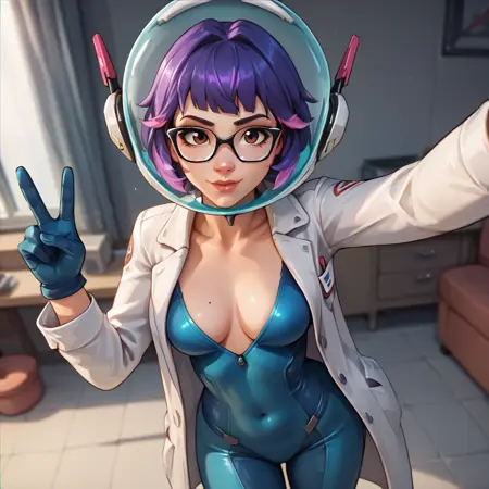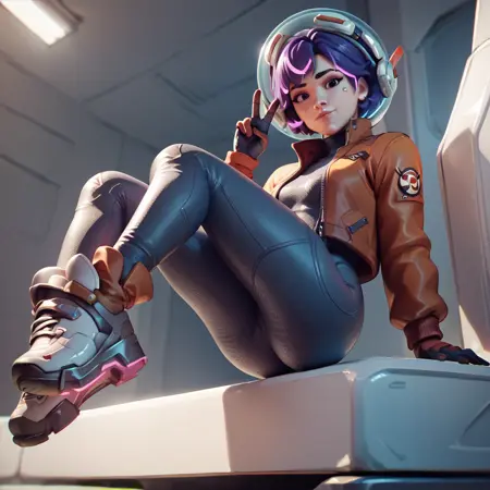 核心标签(穿制服):juno overwatch, 紫色头发, 短发, 手套, 连体衣, 露脐, 乳房, 中等大小乳房, 蓝色手套, 多色头发, 粉色头发, 太空头盔