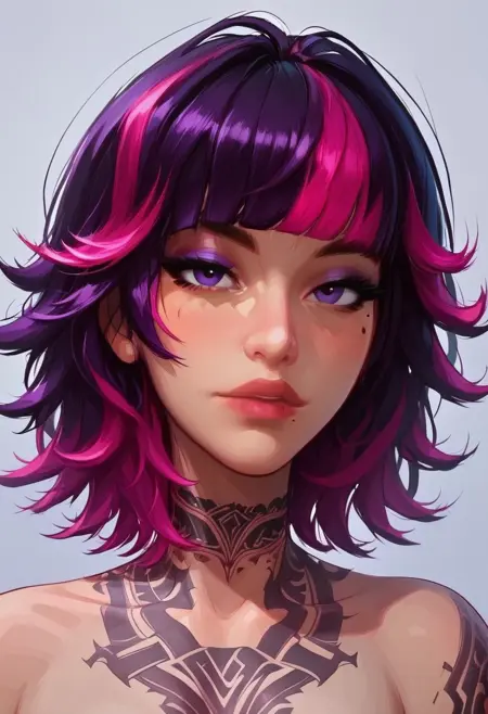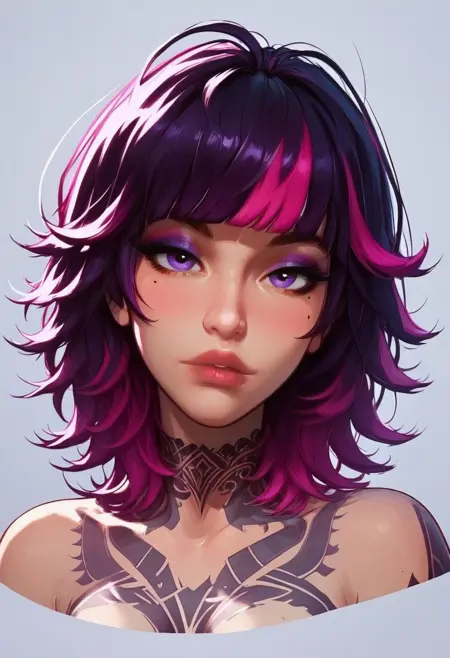Generates my OC(in the title): a girl with a wolf-cut, two-toned hair, purple eyes, some tatts, and(unless otherwise prompted) a scantily worn outfit.