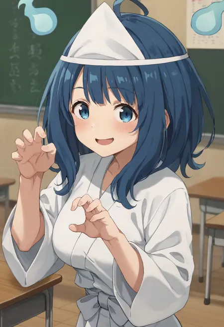 anna-ghost, yanami anna, blue eyes, blue hair, medium hair, triangular headpiece, ghost costume, ghost hair ornament, japanese clothes, wide sleeves, hitodama