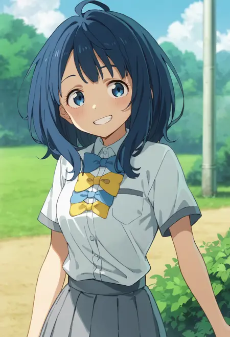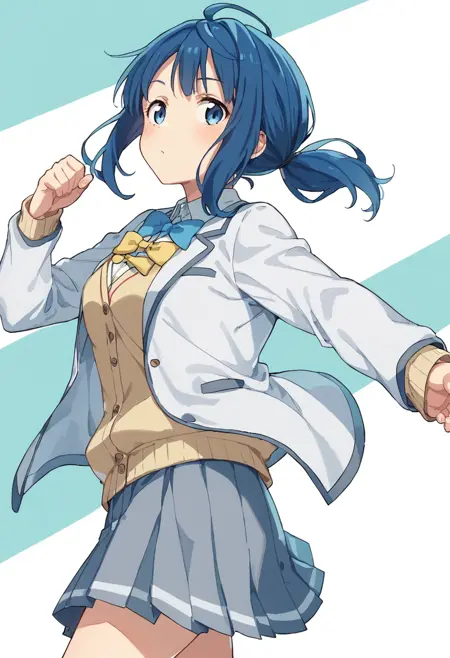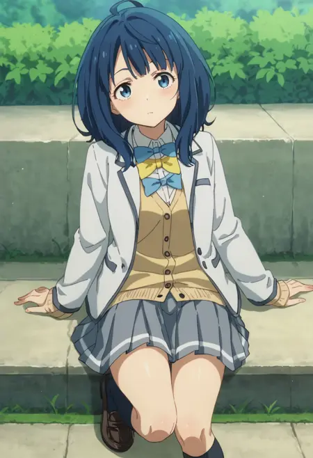 anna-default, yanami anna, blue eyes, blue hair, medium hair, school uniform, white jacket, long sleeves, yellow cardigan, bowties, grey skirt, pleated skirt, black socks, loafers