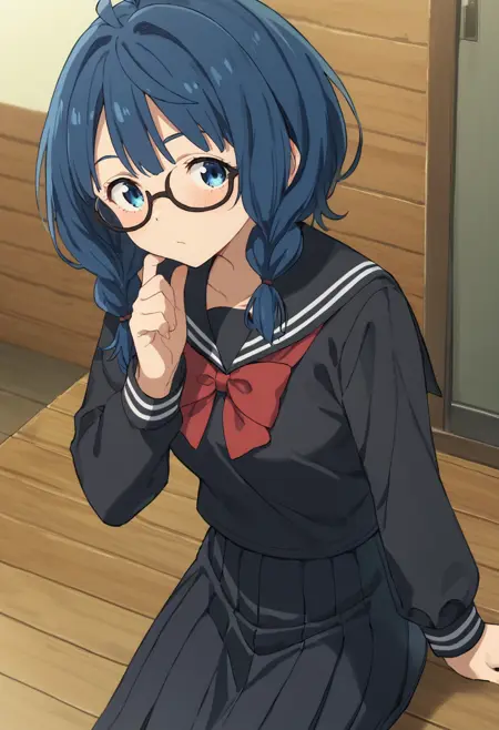 anna-serafuku, yanami anna, blue eyes, blue hair, twin braids, black serafuku, red bow, black shirt, long sleeves, black skirt, glasses