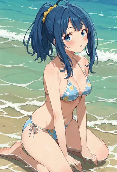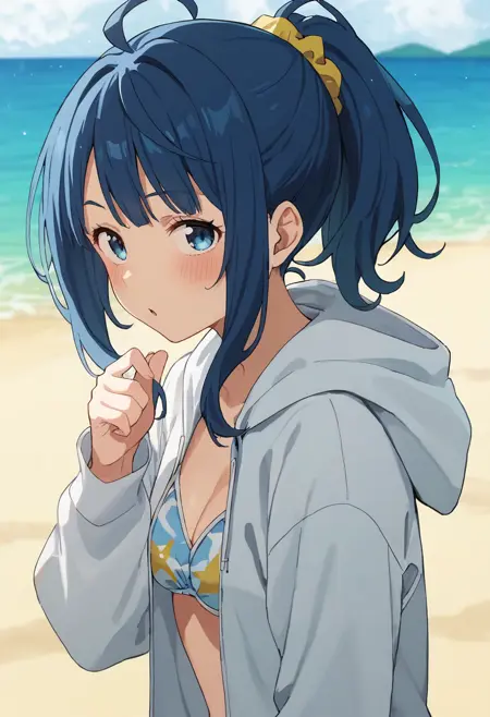 anna-swim, yanami anna, blue eyes, blue hair, ponytail, hair scrunchie, blue bikini, print bikini, side-tie bikini bottom, white hoodie, long sleeves, open hoodie