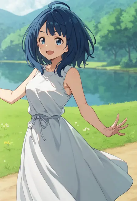 anna-casual, yanami anna, blue eyes, blue hair, medium hair, white dress, sleeveless