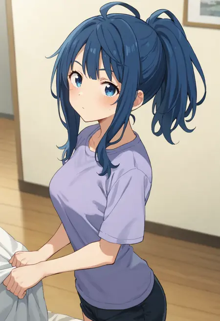 anna-casual, yanami anna, blue eyes, blue hair, ponytail, purple t-shirt, black shorts